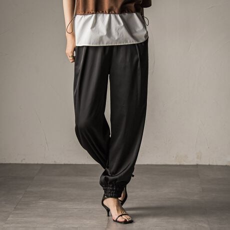 とろみのあるサテン素材が、裾絞りのラフなフォルムに品を添えます。