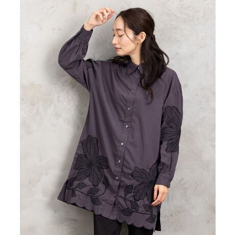 シンプルなシャツワンピースに、大きめのフラワーモチーフ刺繍を施した印象的な1枚。