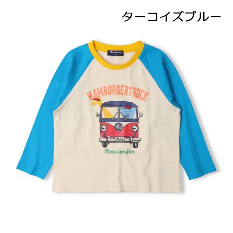 レッドはくまのハンバーガー、ターコイズブルーはキッチンカーに乗ったキリンとぞうのプリント入り。どちらのプリントも帽子の部分が刺繍になっているのがポイント!ラグランデザインの長袖Tシャツ、ロンT。【アイテム】トップス カジュアル お洒落 オシャレ かっこいい かわいい 可愛い 普段着 デイリーウェア お出かけ着 お外着 お外遊び着 子ども服 こども服 男児 男の子 ボーイズ キッズ ベビーサイズ トドラーサイズ 幼稚園 保育園 小学校 通園 通学 小学生 2025年秋冬物新作 丸高衣料 ロングスリーブ 長袖 クマ 熊 きりん ゾウ アニマル 動物 赤色 水色 ムージョンジョン コットン100% 綿100%