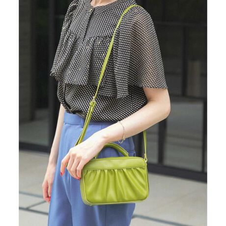 ミニマムなサイズ感で仕上げた、スクエア型のハンドバッグ。シンプルながらも表面のギャザーデザインが、女性らしさを演出します。ストラップ付きのため、肩掛けにも対応が可能◎内側には仕切りポケットがあり、小物を分けて収納できるのも嬉しいポイント。デイリー使いから、ちょっとしたお食事シーンにも活躍する優秀バッグです。