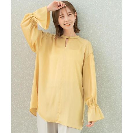 滑らかで艶感のある楊柳サテン地を使用し、ヒップラインが隠れるチュニック丈で設計した上品ブラウス。前後2WAYネック仕様のため、ギャザーを施したデザインとVカットデザインを気分に合わせてお楽しみ頂けます。キャンディースリーブの袖口はゴム仕様のため、袖丈やボリューム感をお好みの位置で着用可能◎サイドには深めのスリットを入れ、トップスインもアウトも様になる着こなしに仕上がります。トレンドライクなハーフパンツとの着こなしや、サロペットやベストのインナーとして、袖をポイントに見せたスタイリングもお勧めです。