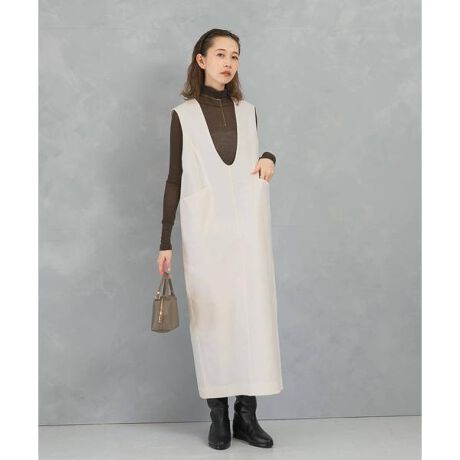 ゆるやかなUネックが、お顔周りを優しい印象に仕上げるジャンパースカート。ふっくらとした風合いに仕上げ、やや光沢感のある綺麗見え素材を採用しました。高め位置にポケットを施すことで、スタイルアップ効果も◎体のラインを拾いすぎない、適度なIラインシルエットですっきりと仕上げました。オケージョンスタイルにも適した、女性らしい華やかさをプラスする一着に。