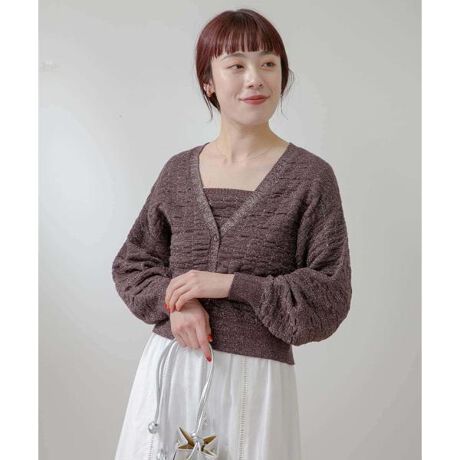 ラメ糸を施したレディライクな雰囲気漂う、ビスチェ×カーディガンのセットアイテムが登場。表面が単調にならない、凹凸感のある素材も魅力ポイントです◎カーディガンはコンパクトな丈感×Vネック仕様で、すっきりとした印象を演出。ビスチェはカーディガンと一緒にトップス風に着たり、シャツやカットソーにビスチェをレイヤードした旬な着こなしもお勧めです。着回し力が高く、ワードローブで活躍する優秀アイテムに。