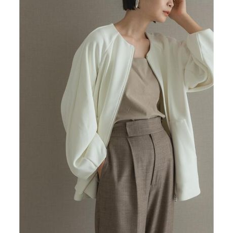ボリューム感と柔らかな膨らみが魅力のダンボールコート。UVカット・透け防止・2WAYストレッチと多機能な素材を採用しました。首元は、インナーを選ばないノーカラーデザインでご用意。背中にタックデザインを施し、身幅・着丈に余裕を持たせたシルエットです。アウトポケット×金属ファスナーでこなれ感をプラスした、好バランスな一着に。
