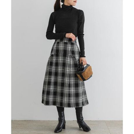 【品の良いコーデが完成するツイードチェックスカート】