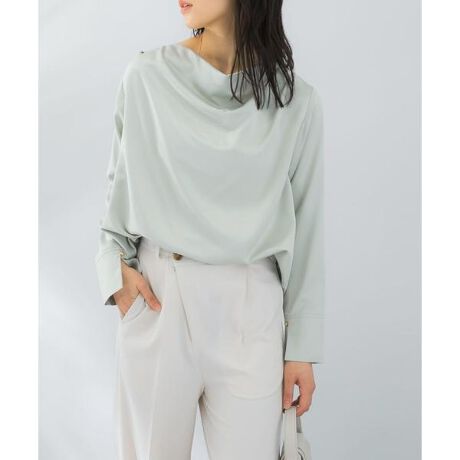 程良い肉感と美しい光沢のサテン素材を使用したドレープネックブラウス。柔らかなフロントのドレープ感が、女性らしさを演出します。袖口にはスリット×ゴールド釦を添え、上品さをプラス。デコルテをきれいに魅せるお顔周りの設計で、ジャケットやカーディガンのインナーとしても万能です◎都会的でシャープなOFF WHITE・MINTの2色展開でご用意。