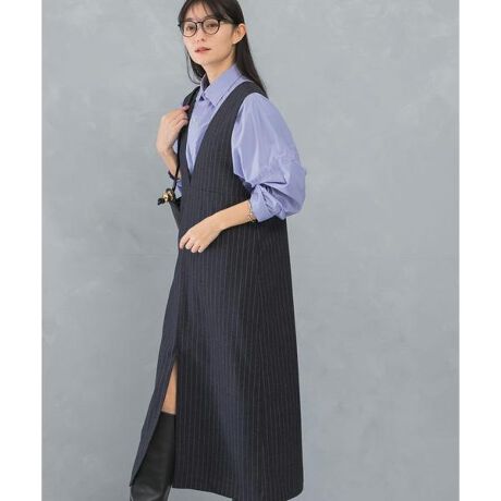ストライプ地が目を惹く大人のリラクシーワンピース。ボディラインを拾わないゆったりとしたシルエットですが、お顔周りのVネックがバランスの取れた印象に。深めの裾スリット仕様で、足裁きの良さも魅力ポイントです。脇の開きを大きめに設定することで、ボリュームトップスやニットもレイヤードしやすい一着に。嬉しい前後2WAYデザインのため、着こなしによって幅広いスタイリングをお楽しみ頂けます。