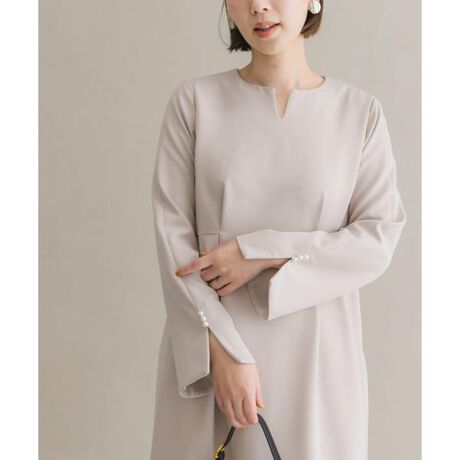 お袖にさり気なく施したパールデザインが、手元を華やかに見せるワンピース。フロント部分のサイドタック×すっきり見えのスキッパーデザインでバランスが取れた一着です。軽やかな足さばきをアシストする、バックスリットも魅力ポイント。女性らしい着丈と、2サイズ展開のためお好みのサイズ感で着用可能です◎トレンドのツイードジャケットをプラスすれば、オケージョンスタイルにもぴったりなアイテムに。