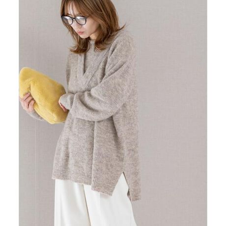 まるでクルーネックと深Vネックをレイヤードしたような、華やかなデザインニット。チクチク感のない肌触りの良いニット素材を採用しました。ヒップが隠れるミドル丈の設定で、サイドスリット仕様が抜け感を演出。程よいルーズ加減で、ワイドパンツやナロースカートとも好相性です。スタイリングに馴染むbeige、秋冬らしいニュアンスのblueとの2色展開でご用意。