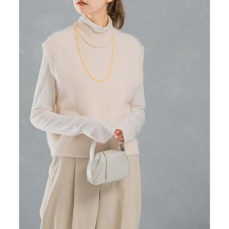 ふわっとエアリーな風合いで存在感のあるニットベスト。フォックス混素材のため、毛吹きが上品でリッチな質感が魅力的です。保湿性も高くチクチク感のない、リラクシーな着心地も嬉しいポイント◎着丈も身幅もコンパクトに仕立て、幅広いボトムとバランス良く決まるデザインに拘りました。広めのアームホールを設定することで、デザインブラウスやワンピースとのレイヤードアイテムとしても着回し可能な一着に。