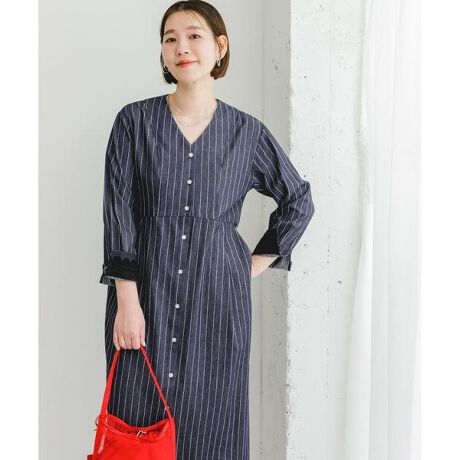 ストライプ柄の効いた、一枚で様になるデニムワンピースが新登場。程よい厚みがありつつ、柔らかで肌なじみの良いデニム生地を採用しました。フロントの釦デザイン×ストレートシルエットが、女性らしいすっきりとした縦ラインを演出。袖口の内側にはレース仕様を採用し、お袖をまっくた際にはフェミニンさをさり気なくプラスしました◎足元は、ラフなスニーカーやヒールサンダルなど幅広くお楽しみ頂ける一着に。