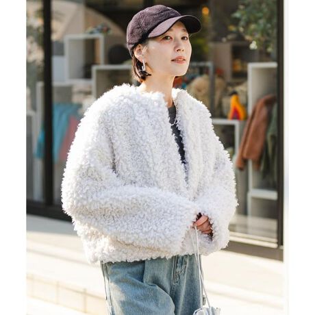 存在感のあるプードルボア素材を使用した、暖かみのあるショートジャケット。思わず触りたくなるボアの毛並みがカジュアルな雰囲気ながら、コーディネートに華やかさをプラスしてくれます。合わせやすいショート丈と、ノーカラーデザインで女性らしさを演出。裏地を採用し、身幅をやや大きく作ることでニットも着こみやすい仕様です。スタイリングを選ばない、OFF WHITE・C/GRAYのベーシックな2色展開でご用意。