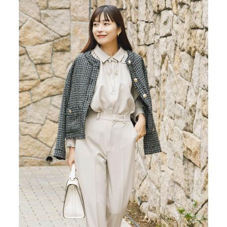ギャザーブラウス×ストレートパンツがセットになった、華やぎアイテムが登場。ブラウスは、コンパクトな襟元×リボンディテールがキャッチーな印象漂います。ギャザーが立体感を演出してくれるため、1枚でも着映えするアイテムに。パンツはストレートシルエットで、身体のラインを拾いにくくリラクシーな着心地を実現します。ツイードジャケットやジレとの、大人レディなレイヤードスタイルもお勧め。