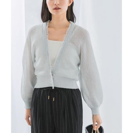 さっと羽織れて着映えする、デザインカーディガンが新登場。フリンジ編みの特徴的な風合いで、軽さのある編地感はリラクシーな着心地です。深めのVネック仕様のため、お顔周りをすっきりと演出。ドルマンスリーブは抜け感たっぷりの一着となります。ショート丈で設計することで、幅広いボトムやワンピースと好相性の一着に。