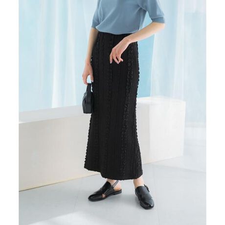 ストライプ状のジャガード柄が、縦のラインを強調しすっきりと見せてくれるスカート。やや肉感があるため、インナーのラインも拾わず安心感のあるデザインです。細すぎないシルエットで、ウエストゴム仕様のためリラクシーな着心地を実現。深めのスリットデザインが女性らしく、足元に抜け感を演出します。着こなしがマンネリ化しやすい夏時期に活躍する、表情を楽しめる一着に。