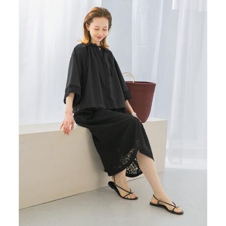 大胆なレース切り替えがトレンドライクな印象のデザインワンピース。シアー素材に表面感のあるレースをドッキングした、拘りの一着です。胸元のリボン仕様やバッグギャザーは、大人の抜け感を演出。ペチコートが付きのため、1枚でも透け感を気にせず着用頂けます。ロング丈×リラクシーなシルエットで、イージーパンツやデニムをレイヤードさせて着こなしもお勧め。