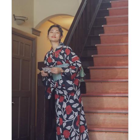 100年近く前の大正時代から昭和初期に流行したバラの表現をそのまま柄にした復刻ゆかた赤のバラと白の葉はレトロ感にあふれながらも古さを感じさせず、ファッション性を高めてくれるような絶妙なバランスで描かれています。丸みを帯びたバラの輪郭にマッチするよう、地色は女性らしい紫がかった紺色に。バラの赤は、地色に最も映えるカラーバランスで仕上げました。