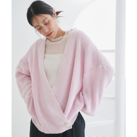 裾に釦を二つ留めて着用するカシュクールデザインのニット。
