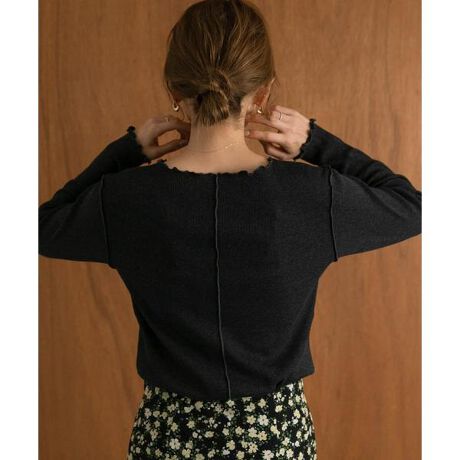 襟ぐり、袖口、裾のメローデザインがポイントのプルオーバー。