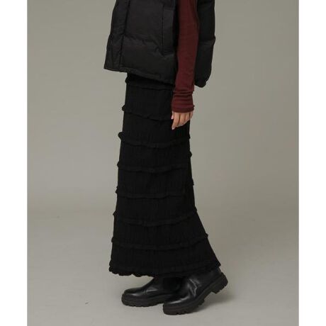 編地切替やフリル部分のディティールにこだわり、大人かわいいニットスカートに仕上げました。