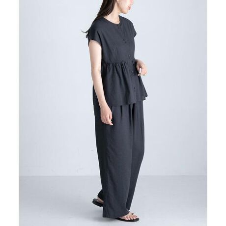二の腕を程よくカバーする袖丈と切替から裾に広がるペプラムシルエットで、細見えワザがつまったペプラムブラウスと、タックがたっぷり入ったワイドシルエットのイージーパンツがセットになったアイテム。