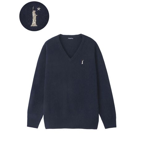 Special Color〈シャンパン女神〉は女神と星の刺繍入り。胸元に輝くシャンパン女神刺繍とラムの素材感で上品な雰囲気のセーター。生後6〜7ヵ月の子羊から採取した毛だけを使用したこだわりの素材ラムウールを100%使用。ふんわり柔らかな着心地で、風合いもよく、暖かなニットです。ほどよいVネックの開きはインナーのシャツとの相性もよく、リボン・ネクタイとのバランスも絶妙です。袖口リブには、ストレッチ性のある細い糸が入っています。また、袖口の合わせ部分をミシンできちんと縫いとめて耐久性をアップしています。左胸にシャンパンゴールドの女神刺繍入り。