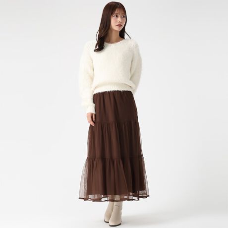 【WEB限定アイテム】ふわふわなニットと、軽く華やかなチュールスカートとのセットが主役級の可愛さ。トレンドのブラウンと、淡い色味でワントーンスタイルのブルーの2色展開。別々で合わせてもかなり使えるアイテムです!ニットの首元は程よい抜け感のVネック。スカートはブーツも合わせやすい丈感。ウエストはオールゴム仕様で着心地抜群です。