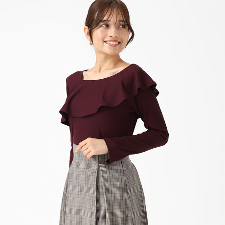 【WEB限定アイテム】たっぷり、上品に揺らめくフリルが印象的なカットソー。カットソーでも可愛くフェミニンに着こなしたい方におススメ。お袖のスリットが程よい抜け感を演出します。端境期の気温にも対応する、使いやすいカットソー素材です!いち早く秋を取り入れられる、こっくりカラーの展開が魅力的なアイテムです。ふんわりとしたフリルがガーリーな印象を与えるカットソー。袖口にはスリットを施しており、さりげない抜け感を演出します。アシンメトリーなショルダーのデザインもポイント。ボトムスにタックインしたコーディネートがおすすめです。