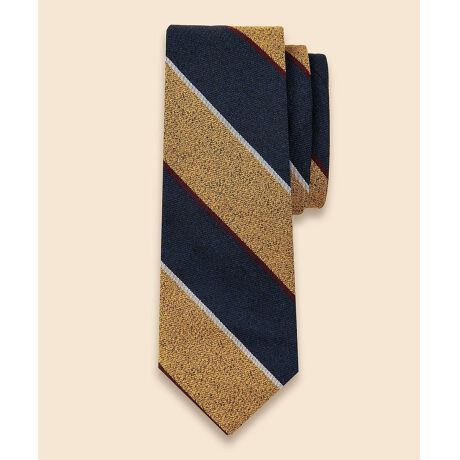 眺めているだけで秋冬の着こなしが次々と頭に浮かぶような、魅力的な配色のストライプタイです。休日のジャケットスタイルから、ビジネスシーンまで幅広くお使いいただけます。ツイード、フランネル、コーデュロイといった起毛感のあるジャケットと相性が良く、Vゾーンに季節感をプラスします。ネイビーブレザーとも相性の良い一本です。イタリアのテキスタイルメーカー、Classico Seta社の生地を使用し、日本国内で丁寧に縫製しました。