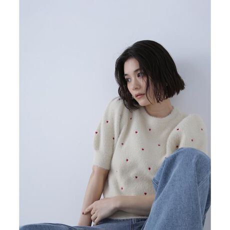 <LIMITED EDITION>【毎月25日〜】official siteで予約スタート!限定14店舗とofficial siteのみで展開の今気分を叶えてくれる限定商品トレンド感のあるハートモチーフの刺しゅうを全面にあしらったニットプルオーバー。柔らかな肌触りで着心地も良く、ふわふわとしたシャギー糸で編み立てた、半袖パフスリーブのデザインです。ドット柄にも見えるような、配色の効いた小さいハートモチーフの刺しゅうが甘くなりすぎず、オトナの可愛さを引き立てながら着ていただけます。<素材>ふわふわとしたシャギー糸で編み立てています。チクチクしにくくやわらかな肌当たりです。小さいハートモチーフの刺しゅう入り。<詳細>仕様・開閉なし裏地・なし透け感・なし / 光沢・なし / 伸縮性・あり生地の厚さ・普通※モデルの着用画像の場合、光の当たり具合により、実際の色味と異なって見えることがございます。色味は、商品単体の画像をご参照ください。