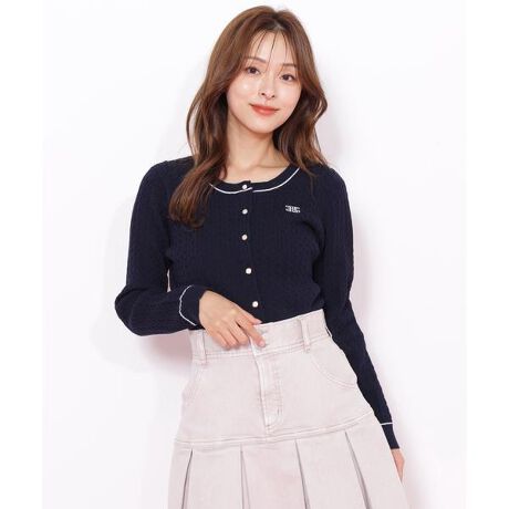 ミニケーブル編みと配色ライン、胸元には刺しゅうロゴを入れたコンパクトカーディガン。メリハリの効いた配色がコーディネートに映える、レトロ感漂うデザインです。1枚着としても羽織りとしても着回し力抜群なので、コーディネートの幅を広げながらロングシーズン活躍します。※撮影時照明の関係により、色味が違って見える場合がございます。またパソコン・スマートフォンなどの環境により、若干製品と画像のカラーが異なる場合もございます。予めご了承ください。商品の色味は、商品単品画像をご参照下さい。※商品画像はサンプルのため、色味やサイズ等の仕様に変更がある場合がございますので、予めご了承ください。
