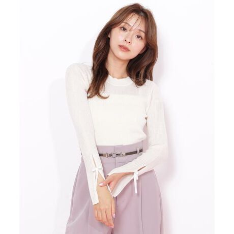 程よい透け感と上品なキラキラ感がポイントのリブニット。細くて華奢な糸にスパンコールを一緒に編み込んだ糸を使用しています。1枚で着るのはもちろん、インナー使いもできるデザインです。袖口のスリットとリボンが愛らしいポイント。使いやすい黒とホワイト、トレンドカラーグリーンの全3色展開です。※撮影時照明の関係により、色味が違って見える場合がございます。またパソコン・スマートフォンなどの環境により、若干製品と画像のカラーが異なる場合もございます。予めご了承ください。商品の色味は、商品単品画像をご参照下さい。※商品画像はサンプルのため、色味やサイズ等の仕様に変更がある場合がございますので、予めご了承ください。