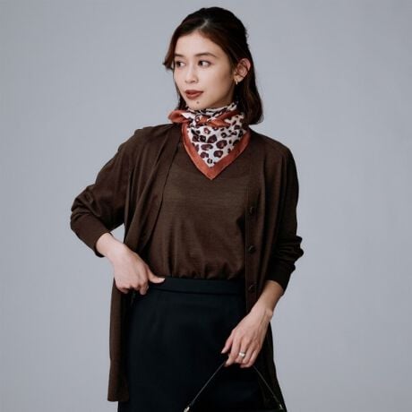 綺麗めアンサンブルでボリュームのあるバルーンスカート(商品番号:153−74402)や太すぎないストレートパンツ(商品番号:153−64400)と、シャツの上にパール調のアクセをポイントにしたり、Tシャツにカーディガンを羽織ってデニム(商品番号:153−64300)合わせもおすすめ。
