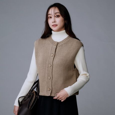 ざっくりした編地ながら柔らかなコットンウールの軽やかで快適な着心地のショート丈ニットベスト。