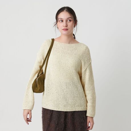 テープヤーンをゆるめに編み立て、ルーズな雰囲気にこだわったニットプルオーバー。