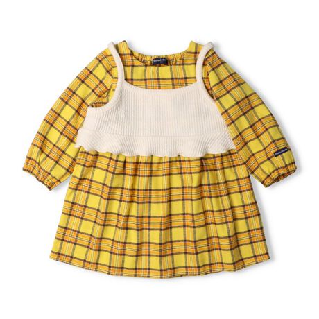 ネル素材のタータンチェック柄の長袖ワンピース。リブ素材のキャミ、ビスチェ付き。ワンピースだけでもビスチェを重ね着しても、ビスチェを他のTシャツなどと合わせて着ても。色々と着回し出来るアイテム。【アイテム】トップス シンプル ガーリー フェミニン カジュアル お洒落 オシャレ かわいい 可愛い 普段着 デイリーウェア お出かけ着 お外着 お外遊び着 子ども こども 女児 女の子 ガールズ キッズ ベビーサイズ トドラーサイズ 幼稚園 保育園 小学校 通園 通学 小学生 2025年秋冬物新作 丸高衣料 ロングスリーブ 長袖 黄色 イエロー ネイビー 紺色 ムージョンジョン