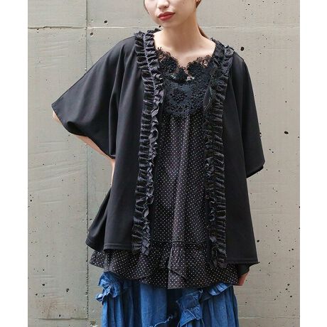 衿ぐりから前中心にたたいているドット生地がトレンド感を出しつつ、コーディネートのアクセントに◎。