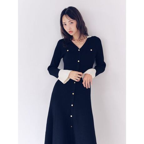 襟とゴールドボタンが品のあるクラシカルな印象を与えるリブニットワンピース。長めのフレアシルエットながら、スキッパー開きでデコルテに抜け感を加え、重くなりすぎない仕上がりに。袖口は手首を華奢に見せるフレアスリーブにし、細部まで女性らしさを意識したデザインです。カラーごとに異なる配色が施され、1枚で印象の違いを楽しめるバリエーション展開も魅力です。