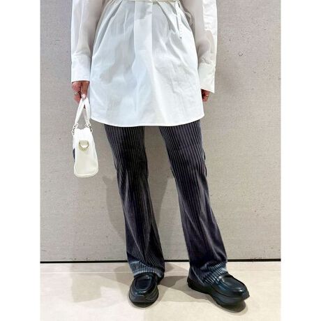 裾に向かって広がるフレアラインが、脚をすらりと長く見せてくれる美脚パンツ。左脇には「LILY BROWN」オリジナルのロゴ刺繍をあしらい、さりげないアクセントに。ウエストはぐるりと一周ゴム仕様で、リラックスした穿き心地ときちんと感を両立しました。