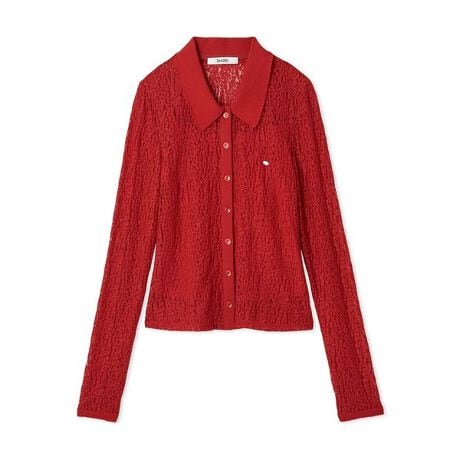 繊細なカットソーレースを使用し、今季らしい透け感を演出したフェミニンなポロ襟ブラウスをお作りしました。フィット感のあるデザインですが、伸縮性のある生地なので締め付けなくすっきりとご着用いただけます。前立てと襟は別糸で編み立てアクセントをプラス。胸元にはSNIDELロゴメタルプレートをちょこんと添えてエレガントに。フェミニンな生地感ですが、ポロ襟の形をシャープにすることでモード感をプラス。襟エッジと袖口はフリンジ風飾り編みを施し、繊細に仕上げているのもポイントです。シアー感のあるブラウスですがインナーキャミソール付きなので安心してご着用いただけます。共布・同色でカットレースナロースカート(SWCS254264)もお作りしているのでセットでのご着用もおすすめ。