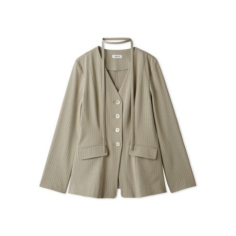 パネルラインを強調したややペプラムなシルエットとツヤのある貝ボタンで、モードな印象もプラスして仕上げました。