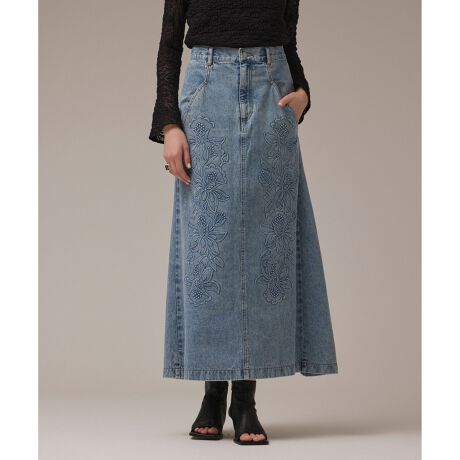 デニムスカートを今季らしく昇華した華やかな一着。コットン100%の10オンスのデニムを使用し、大胆なフラワー柄のエンボス加工を施した、モードな佇まいの一枚。
