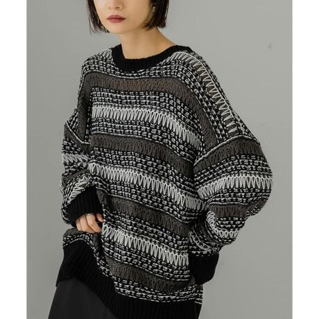 抜け感のあるルーズなサイジングと、女性らしさのある透かし編みデザインを採用したニット。凹凸感のある表面で立体的なスタイリングを完成し、着るだけで華やかに仕上げる1着です。きゅっと詰まったカフスやすっきり魅せるネックラインもポイント。