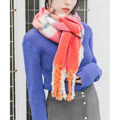 トレンドのラメ糸の入ったチェック柄を採用することで、キャッチーなマフラーに仕上げました。存在感抜群のカラーと、手編みの太フリンジもこだわりのポイントです。冬の暗くなりがちなスタイリングにプラスするだけで、華やかな雰囲気にしてくれます。