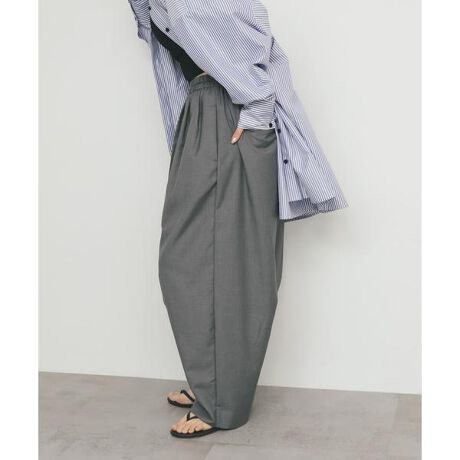 膝位置に大きく取ったダーツによる、カーブシルエットが特徴的なパンツ。ウエストはあえてゴムを寄せることでイージーな仕様に仕上げました。イン・アウトスタイルどちらも叶い、1枚でサマになる1着。ベーシックなGRAYとNAVY、BORDEAUXをご用意しました。