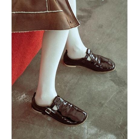 1足は持っておくと便利なTストラップのローファー。つるっとしたガラス生地でしあげたのでメンズライクになり過ぎません。カジュアルコーデにぜひ合わせて見てください。