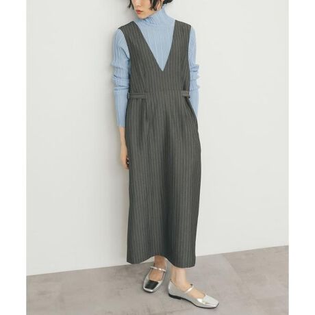 Vネック開きや、ピンストライプ柄でマニッシュな雰囲気に仕上げたジャンパースカート。Iラインで美シルエットも叶い、サイドベルト仕様なのでシルエットの変化も楽しめます。合わせるインナー次第で様々な着こなしができ、オールシーズン活躍します。