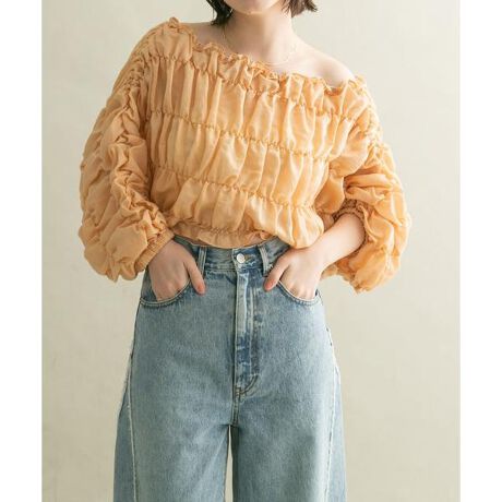 ギャザーをたっぷり使用したデザインが魅力の大人可愛いブラウスが登場。一見普通のブラウスに見えますが、前後上下着用可能な優れもの。上下回転させるとオフショルダーにも変化!合わせるアイテム次第でロングスパンの着こなしが期待できます◎フェミニンな印象のOFF&ORANGE、シックなBLACKの3色展開です。