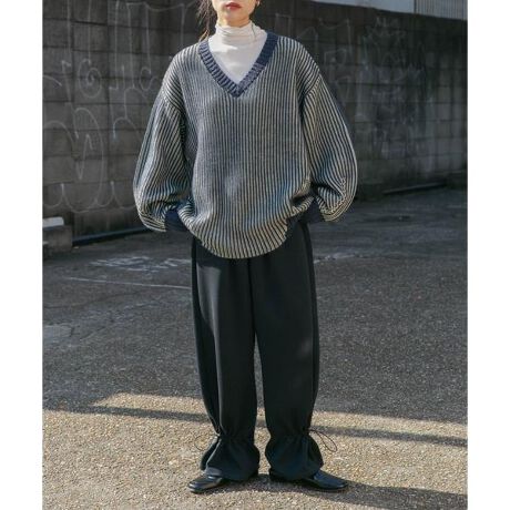 裏表の凹凸感がでるリブ編みがポイントの配色デザインニット。バイカラー仕様にすることでより表面感を出しました。顔周りをすっきりとさせるVネック、腰回りをカバーするサイジングはゆるっとしつつ抜け感を演出します。レイヤードスタイルにもぴったりで、大人カジュアルコーデを格上げしてくれます。