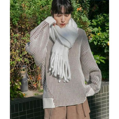 裏表の凹凸感がでるリブ編みがポイントの配色デザインニット。バイカラー仕様にすることでより表面感を出しました。顔周りをすっきりとさせるVネック、腰回りをカバーするサイジングはゆるっとしつつ抜け感を演出します。レイヤードスタイルにもぴったりで、大人カジュアルコーデを格上げしてくれます。